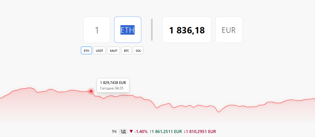 Под конвертером — лёгкий интерактивный график. Выбираете период — 1 час или 1 день — и наводите курсор или проводите пальцем, чтобы увидеть точную цену в любой момент. Удобно для быстрой проверки перед конвертацией, без запуска торгового терминала.