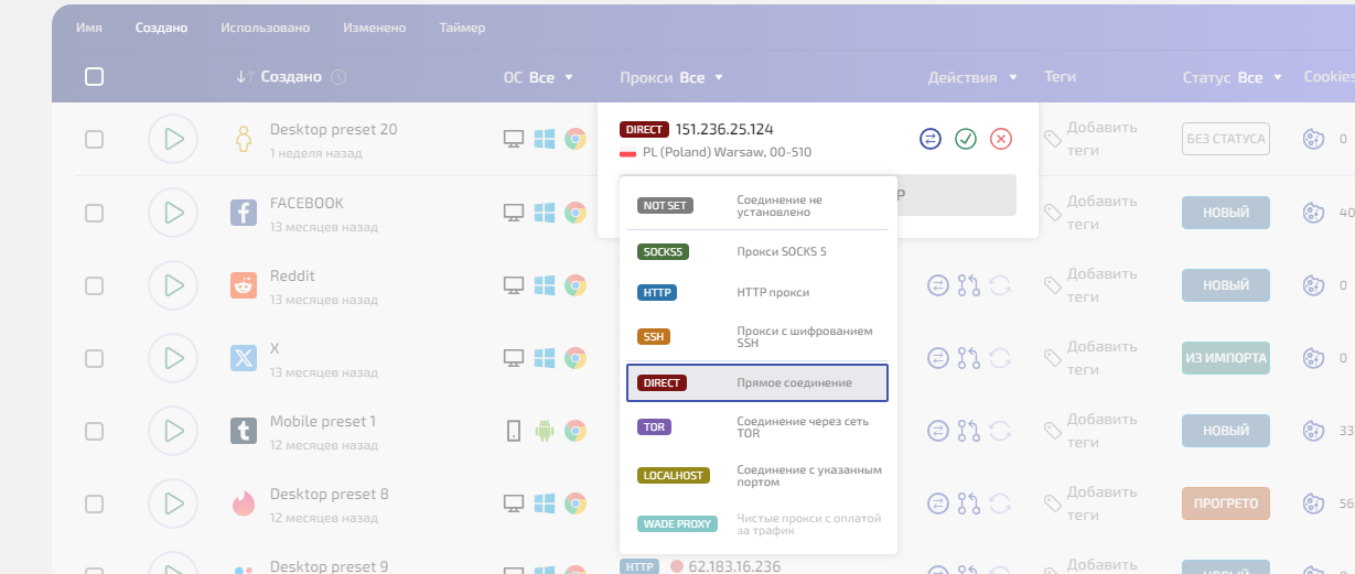 WADE X поддерживает несколько типов соединений — выбор зависит от задачи и того, какой прокси вы используете.
