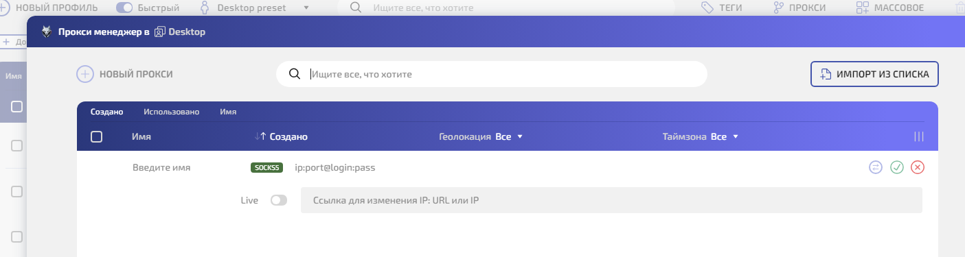 Шаг 3б. Если выбираете из Прокси менеджера: нажмите иконку прокси-менеджера рядом с полем ввода — откроется список прокси которые вы добавили заранее. Выберите нужный одним кликом.