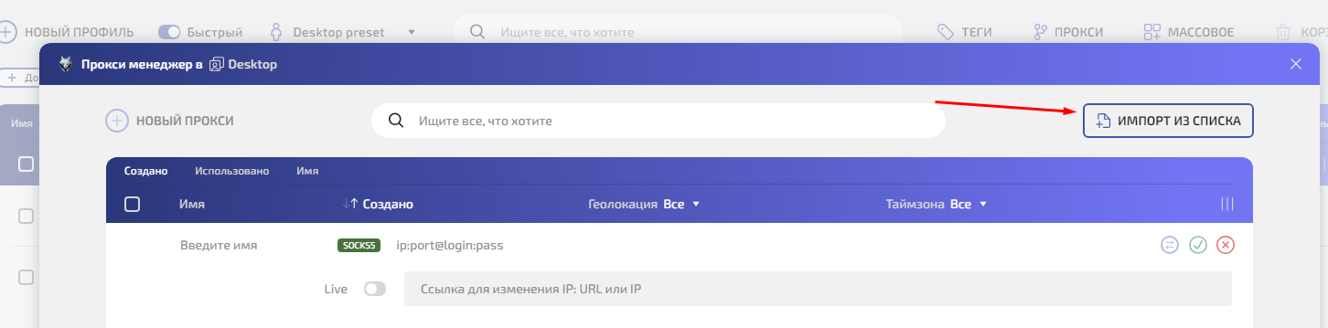 Шаг 3. Или нажмите Импорт из списка для массового импорта — вставьте список прокси построчно.