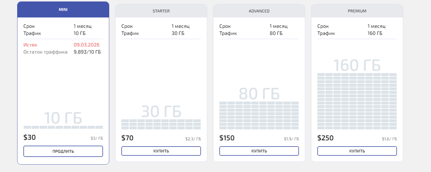 Неиспользованный трафик Wade Proxy не сгорает при продлении подписки. Если вы остаётесь на том же тарифе — остаток переносится и прибавляется к новому пакету. Если переходите на другой тариф — трафик тоже не пропадает: он остаётся на старом пакете и снова станет доступен, если вы вернётесь к нему.