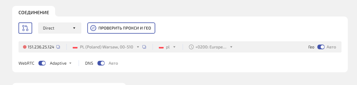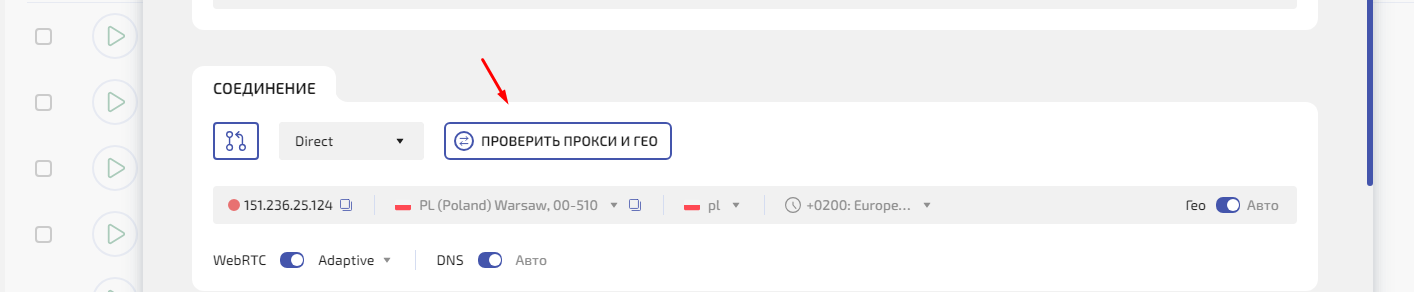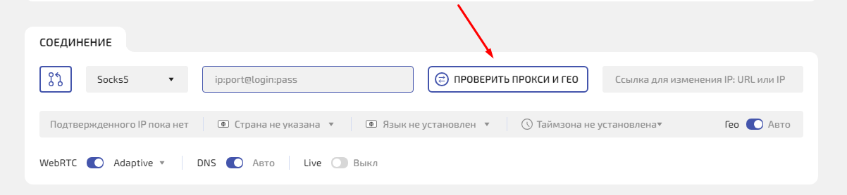 Шаг 4. Нажмите Проверить прокси и гео— система проверит прокси и покажет IP, страну, город и часовой пояс. Профиль при этом не запускается.