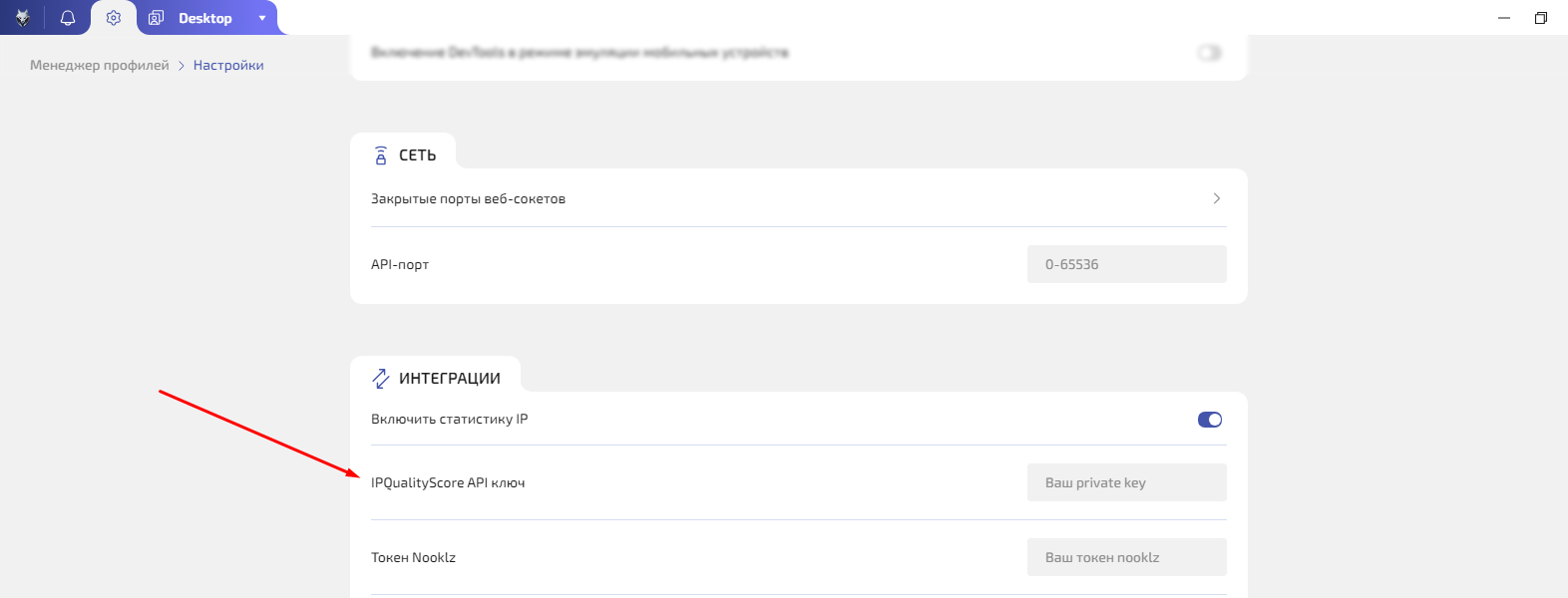 Зарегистрируйтесь на ipqualityscore.com, получите API ключ и добавьте его в Настройки WADE X — так можно проверять чистоту IP прямо в интерфейсе.