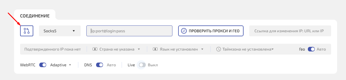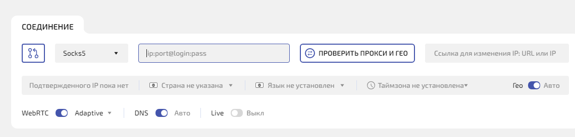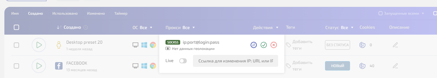 • При необходимости включите Live — поле для ссылки на смену IP (актуально для мобильных прокси с ротацией)