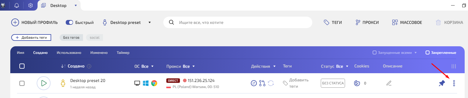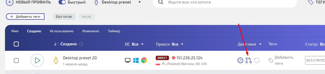 Шаг 1. В списке профилей найдите нужный профиль. В строке профиля вы увидите метку типа подключения — например DIRECT, HTTP, SOCKS5.