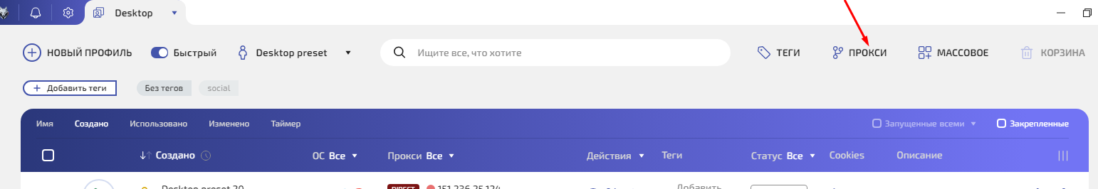 Шаг 1. Нажмите кнопку Прокси в верхней панели. Откроется Прокси менеджер.